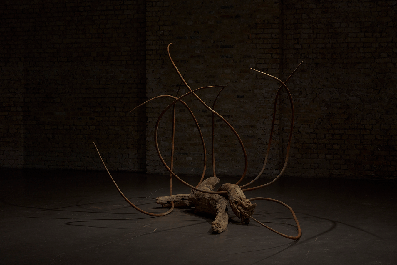 Uncertainty, for White, is fundamental. “The sea,” she has said, “is a site of impossibility—a flattening of time and a rejection of order.” This logic materialises in her sculptures’ apparent disorder. Yet they are far from chaotic. Iron rods scribble into space, mangled yet upright; skeletal forms hover above torn fabrics that stain the floor beneath them. To look at one of White’s works is to witness an incident—a body breached, its blood thrown outward, its breath faintly illuminating the dark. Historically, these works resemble no established sculptural lineage. They neither mimic reality nor seek to fill space in order to ennoble it. Instead, they appear riddled with grief, as though on the verge of rot. It is precisely this tension—between balance and brutality—that White sustains deliberately. As she has explained, she is invested in disrupting the power dynamic between object and viewer. Sculpture, she suggests, has long been conditioned to privilege the audience: to remain inert, elevated, obedient. In her work, menace emerges from fragility. Approach too closely, and the object may collapse—or harm you. Like the artist herself, these works are not passive. To encounter them in situ is to walk the seabed, confronting fear without the promise of resolution.