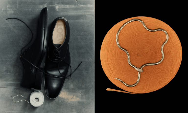 Left: Crown leather Oxfords LOEWE; Right: Serpenti Tubogas yellow gold necklace set with demi pave diamonds and black onyx elements BULGARI