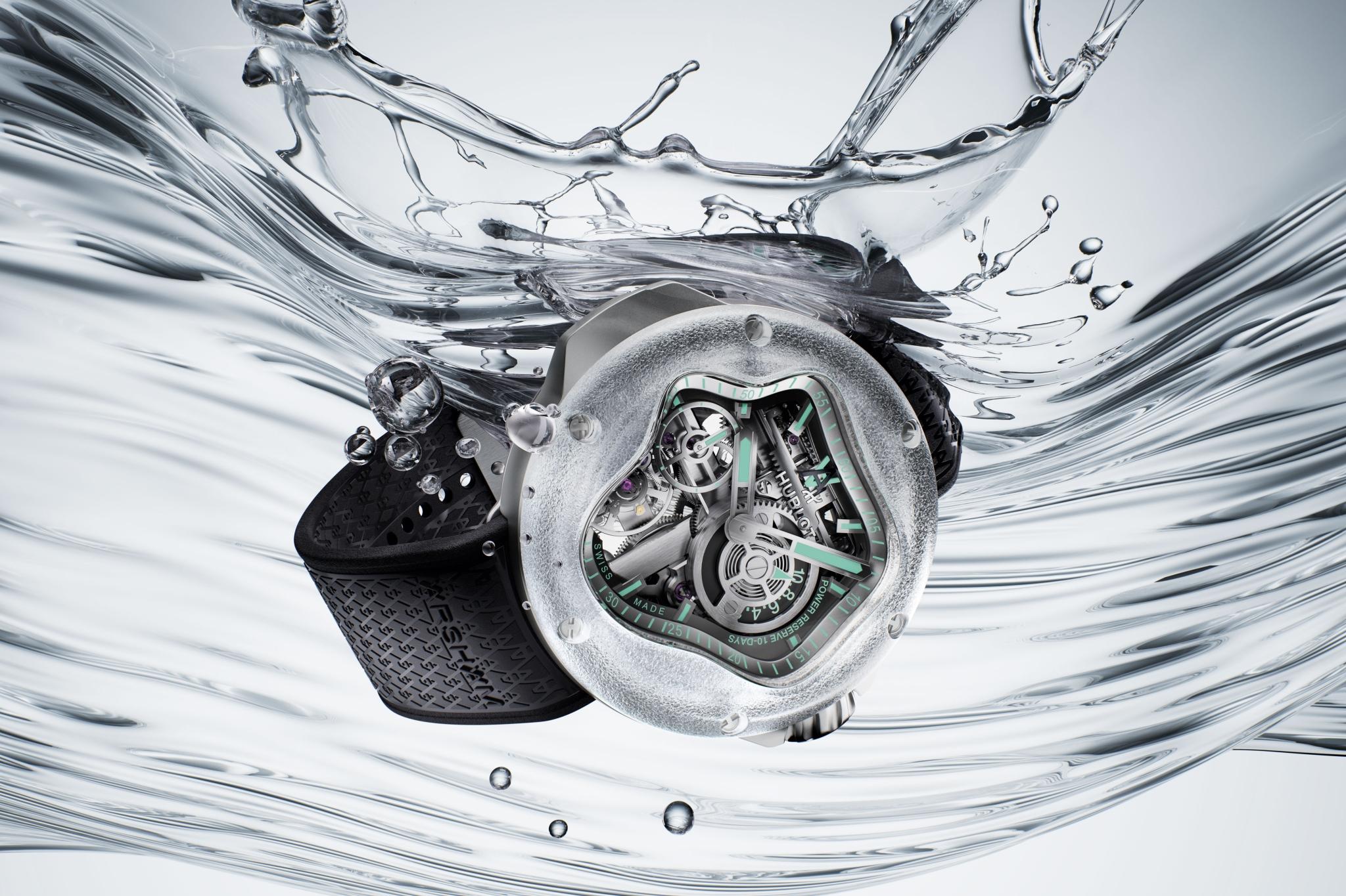 The 42mm titanium and sapphire case takes the shape of a dispersing water splash, a continuation of the droplet-inspired aesthetic seen in the MP-16. With its transparent crystal structure, the piece invites light to dance across its surface, echoing the fluid geometry of water in motion. Inside, Hublot’s in-house Meca-10 manual-wind movement powers the watch, visible through both the dial aperture and sapphire caseback — a true fusion of Daniel Arsham design and Hublot’s mastery of mechanical precision.
