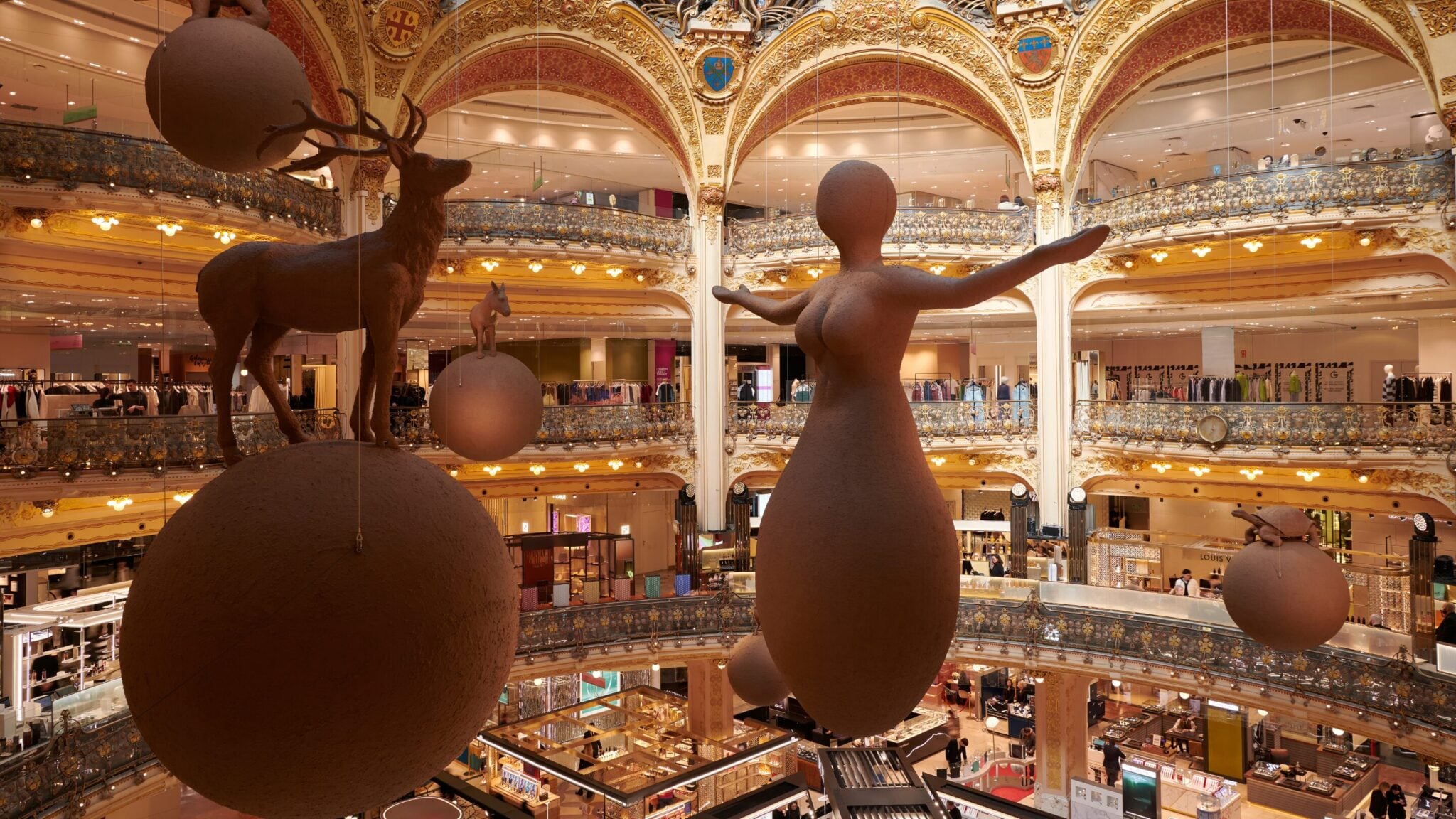 Curated by Maurizio Cattelan and Chiara Parisi, the exhibition is spread across the department store and features works by four contemporary artists. Beneath the glass dome, Gloria Friedmann presents MAMMALIA, in which clay animals gather around a mythical Mother Earth figure to evoke the fragile interconnectedness of life.