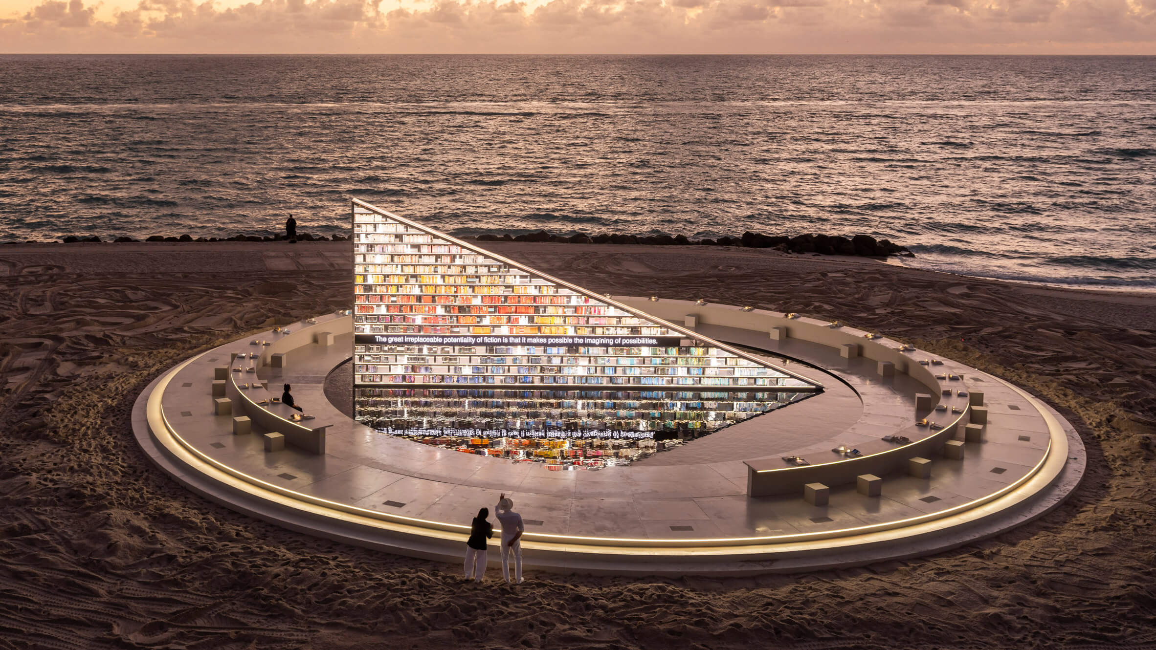 Set directly on the beachfront, Library of Us takes shape as a rotating, 50-foot triangular bookshelf perched above a reflective pool of water. Designed as both sculpture and gathering place, the installation brings together 2,500 books that have influenced Devlin’s creative practice. Arranged with intentional spacing to let light filter through, the volumes glow after dusk, transforming the shoreline into a luminous arena of words.